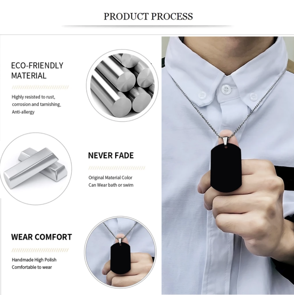Product Weight: 16.4g; Dog tag: 48mm x 28mm; Luxury Military Necklace: 24″ (61cm) with an upgraded clasp.